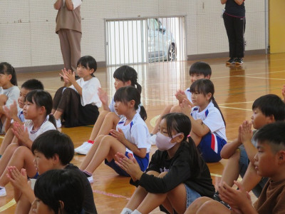 明日は陸上運動記録会です。そこで、児童朝会の時間に激励会を行いました。